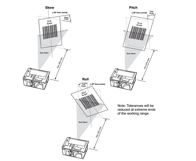 右邊的圖片:在條碼掃描器90°平放的不動,距離條碼25.4mm的情況下條碼左右前后傾斜的角度范圍是:±55°